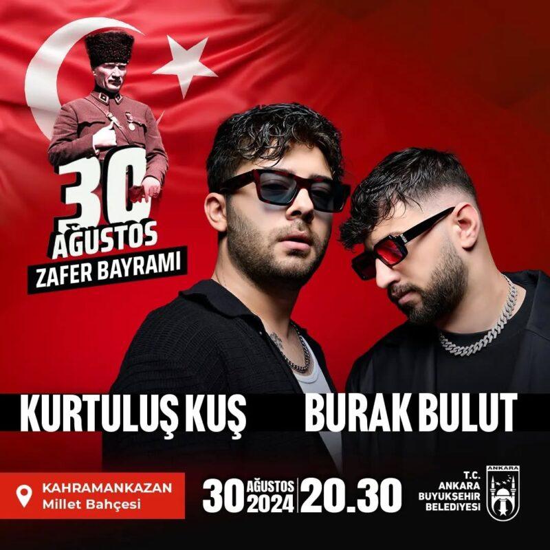 Tamamlandı Kurtuluş Kuş ve Burak Bulut Konseri 📅 30/08/2024 ⏰ 20:30 – 23:00 📍 Kahramankazan Millet Bahçesi KonserÜcretsiz